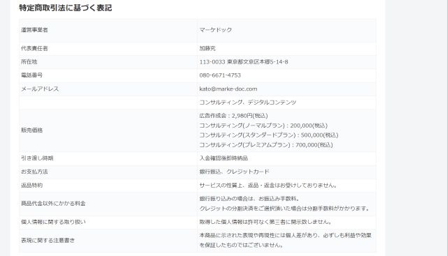 なぜ特商法に会社名の表記がされていないのかは分かりませんが、はっきり言って、これからコンサルティングを依頼する会社の名前も分からないような業者と関わることは不安ですし、参加することはおすすめできません。