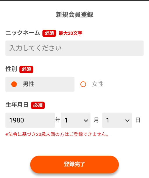 その後、ニックネーム、性別、生年月日の入力を行い、登録完了をタップします。