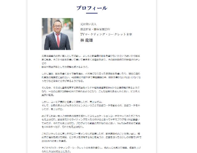この度、林龍雄氏の指導するTVマーケティング・シークレットという集客講座について調査を行いました。