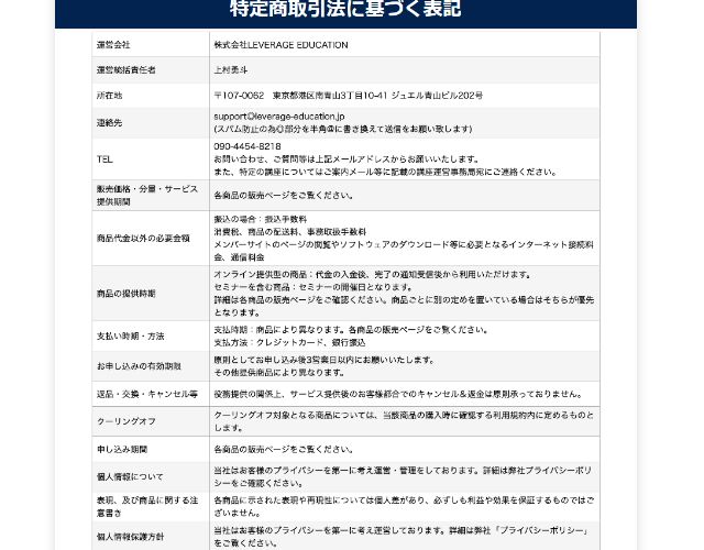 しかし、講座の販売を行っている株式会社Leverage Educationは非常に怪しいと言えるので、参加をオススメすることはできません。