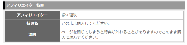 アフィリエイター名が「堀江理玖」と表示されているのを確認したあとに購入に進んでください。