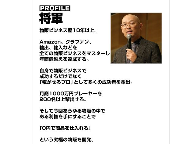 その結果、将軍は過去に「クラウドファンディングビジネス」「100万円テンプレートNEO」などの物販系の案件を開催していることが分かっています。