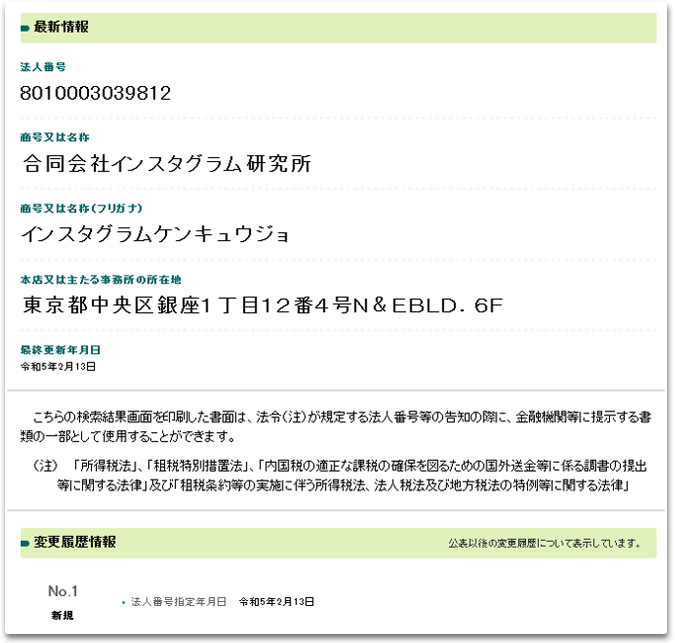 まず、合同会社インスタグラム研究所は、「令和5年2月13日」に法人登記されました。