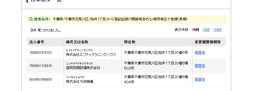 ファミリー(FAMILY)を提供するこの業者が実在する会社なのか、特商法に表示されている「千葉県千葉市花見川区柏井1-20-5」という住所を元に、国税庁の法人公表サイトで調べてみました。