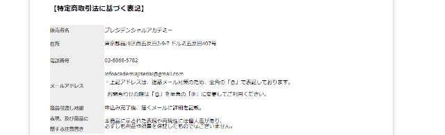 特商法を見ると、「プレジデンシャルアカデミー」という販売者名が書かれていますが、これは業者の会社名ではないことが分かりますね。