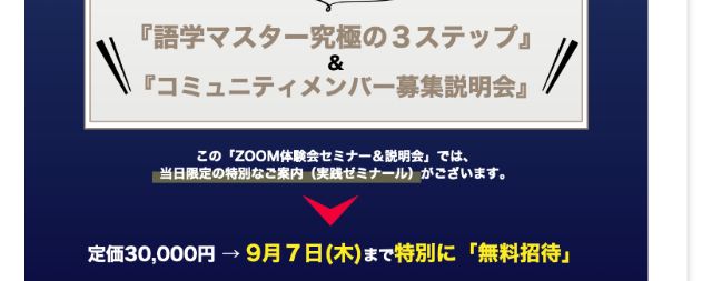 そして、オンライン講座の後には「語学マスター究極の3ステップ&コミュニティメンバー募集説明会」というZoomセミナー&オンライン説明会が予定されています。