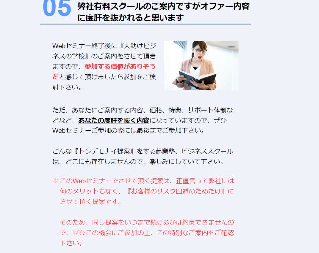 なぜなら、このセミナーに参加すると、必ず人助けビジネスの有料スクールへの勧誘が待っているからです。
