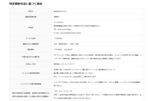 ここまでの調査で分かったところでは、Zoom体験会に参加することで、「TORIDE」というツールが59,800円で販売されると思われます。