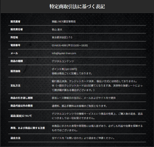 特商法には競艇LINER運営事務局と記載されていますが、○○運営事務局というものは、そもそも会社でも何でもありませんので、表記があっても騙されないようにしてください。