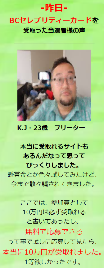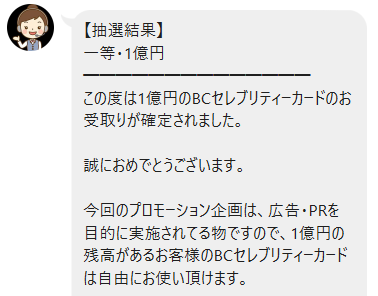 なにやら1億円が受け取れるという「BCセレブリティーカード」という案件を調査しました。