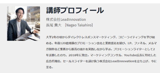 そして、次に、Youtube広告攻略webセミナーの主宰者である長尾貴大について見てみます。