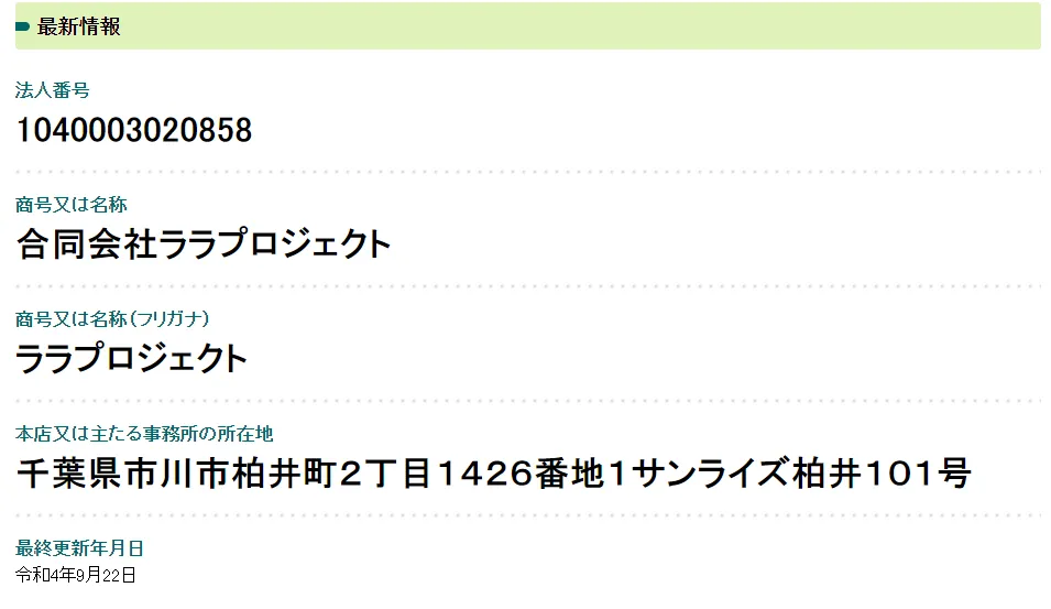 合同会社ララプロジェクトは、2022年9月22日に設立されたことが、国税庁の法人番号公表サイトで確認できます。