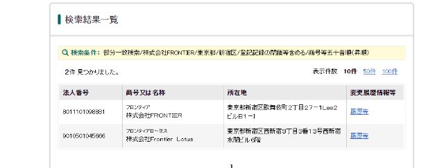 結果として、株式会社FRONTIERという名前の会社は存在することがわかりましたが、特商法に記載されている「東京都新宿区西新宿7丁目1番7号」に住所を置く株式会社FRONTIERは見つかりませんでした。