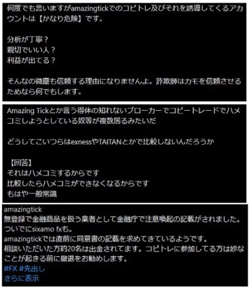 ちなみに、このAmazingTickは注意喚起がいくつかあり、お金を騙し取られる可能性のある危険なブローカーとされています。